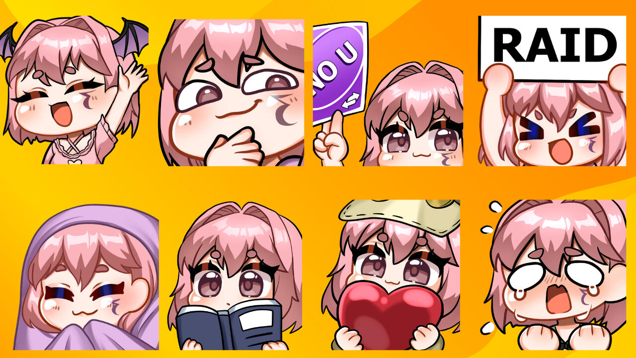 Emotes: Raid, Comfy, Munch, No U, Book, Cry, Smug, Wave, Heart, Sigh